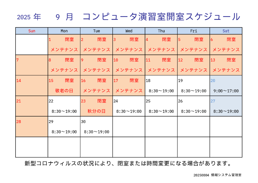 • 23日(火)は祝日のためコンピュータ演習室は終日閉室です
