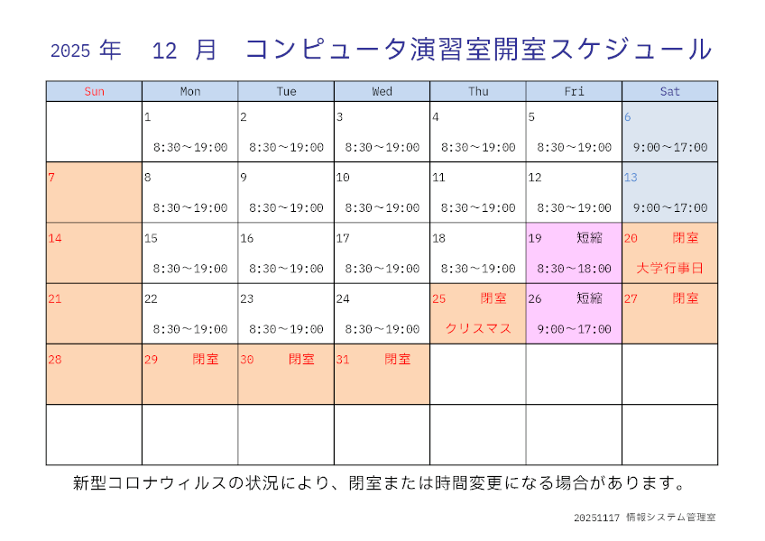 - 25日(木)はクリスマスのためコンピュータ演習室は終日閉室です。